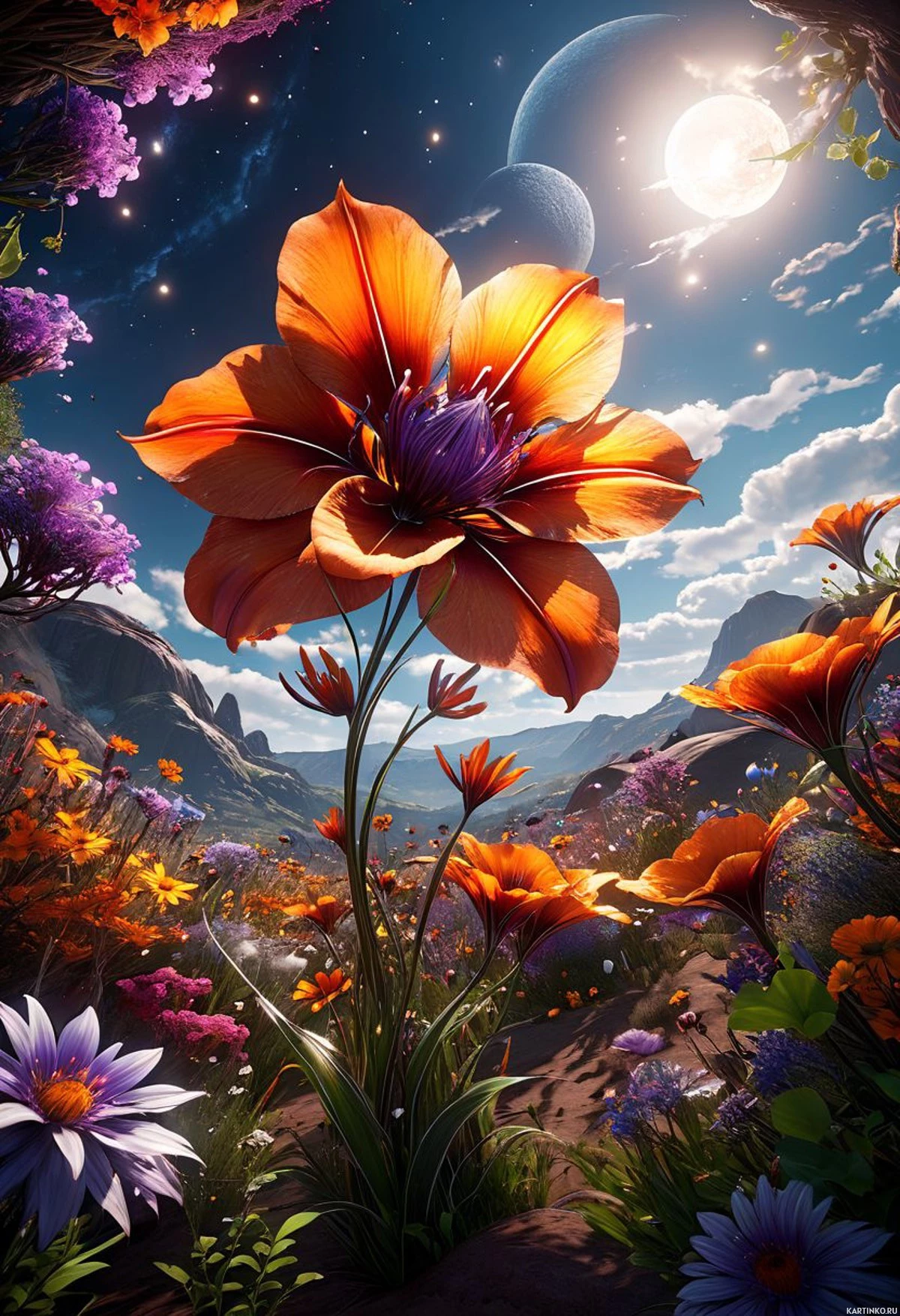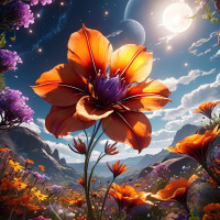 garden scene. At the center is a vibrant orange and