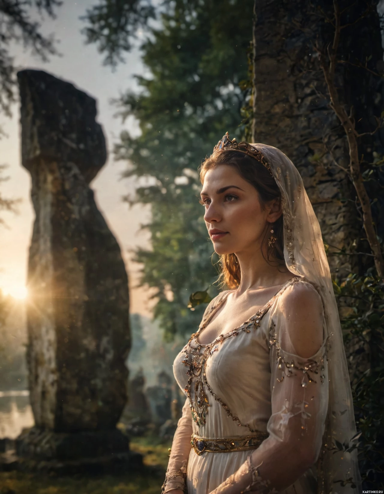 natural light during either sunrise or sunset, which adds to the serene atmosphere of the setting. The ruins behind her include what appears to be