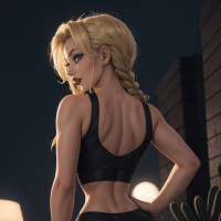 a female character with blonde hair, depicted from behind. She is wearing tight