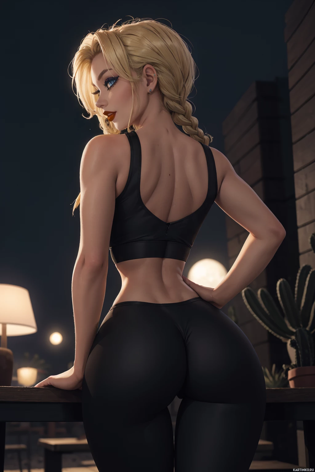 black leggings that accentuate her muscular physique, which could suggest she engages in a fitness-focused lifestyle or is part of an action role. Her posture, leaning slightly against what appears to be a stool, and the slight curve of her back indicate a relaxed yet confident pose. The setting seems to be indoors, possibly a bar or a similar social establishment, given the presence of a wooden surface that could be a countertop and