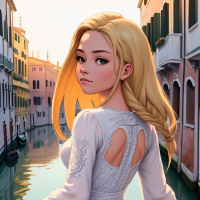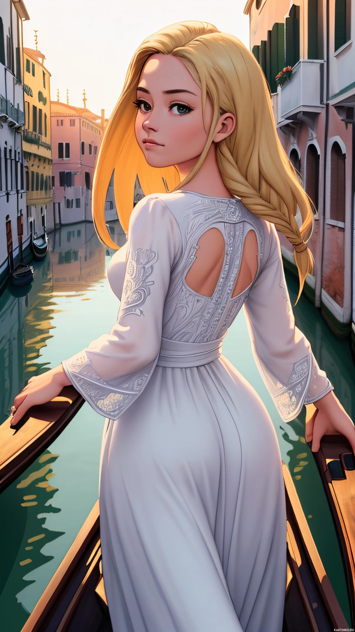 intricate embroidery on the bodice, which could indicate a level of sophistication or a historical context for the attire. The setting appears to be a picturesque Venetian canal, characterized by its narrow waterways and buildings built along the sides. The lighting in the image is soft, with