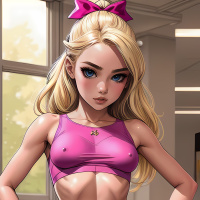 На картинке изображена женщина, стоящая с руками на бедрах. У нее светлые волосы, в волосах – розовый бантик, она одета в облегающий фиолетовый топ, черные шорты и черные ботинки. Её поза выражает уверенность, и она смотрит прямо в камеру. Фон выглядит как интерьер с темной стеной и обстановкой, характерной для современной гостиной или студии.