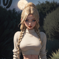 a female character with long blonde hair and a braided updo. She is depicted in a stylized manner, with exaggerated features typical of digital artwork. She has
