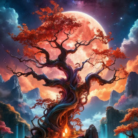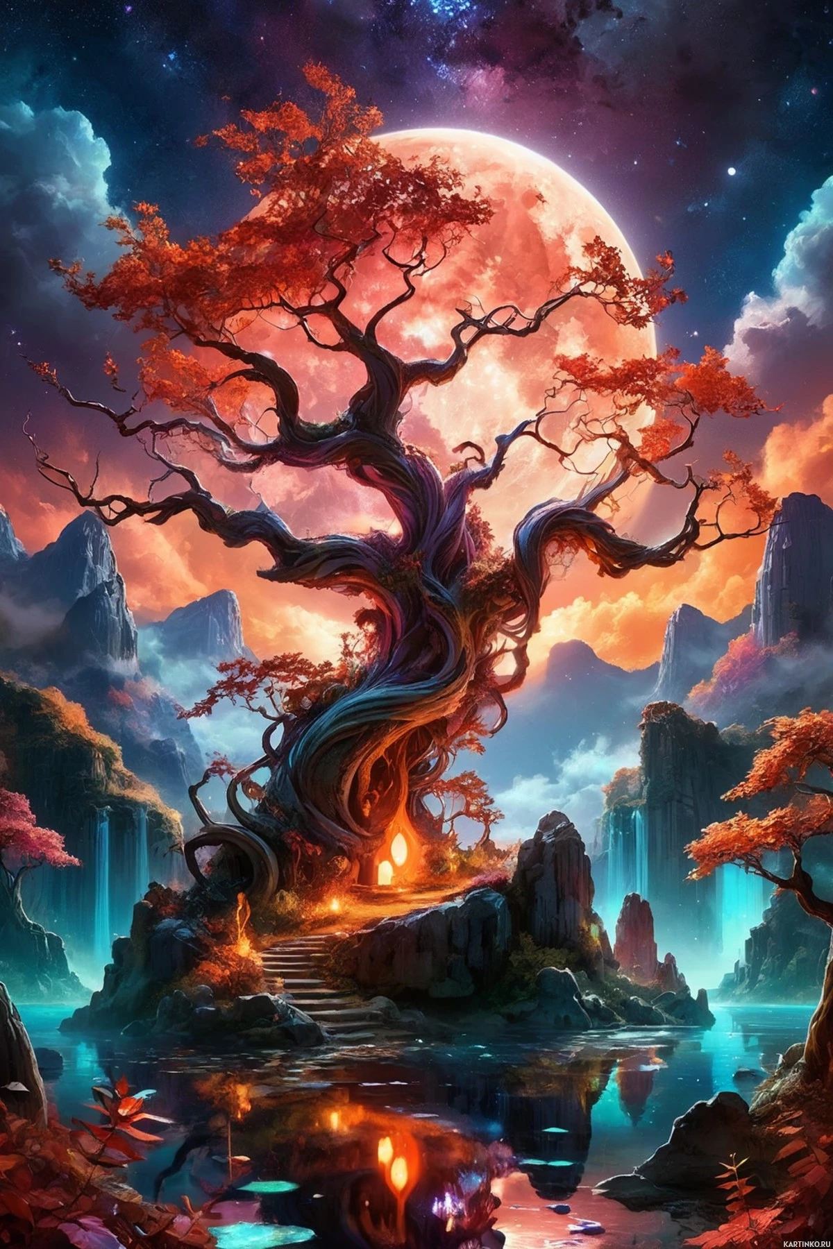 a night sky filled with stars, including a large moon illuminating the scene below. Surrounding the tree are majestic mountains under