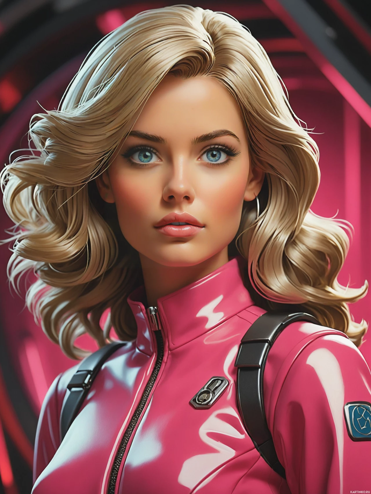 futuristic attire, consisting of what looks like a pink or rose gold bodysuit with a visor-like element across the forehead, suggesting a modern or sci-fi theme. She also has
