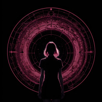 geometric shapes and lines that create a circular pattern around her figure. There are also some stars and a compass-like symbol within the circle. The overall color scheme is dominated by