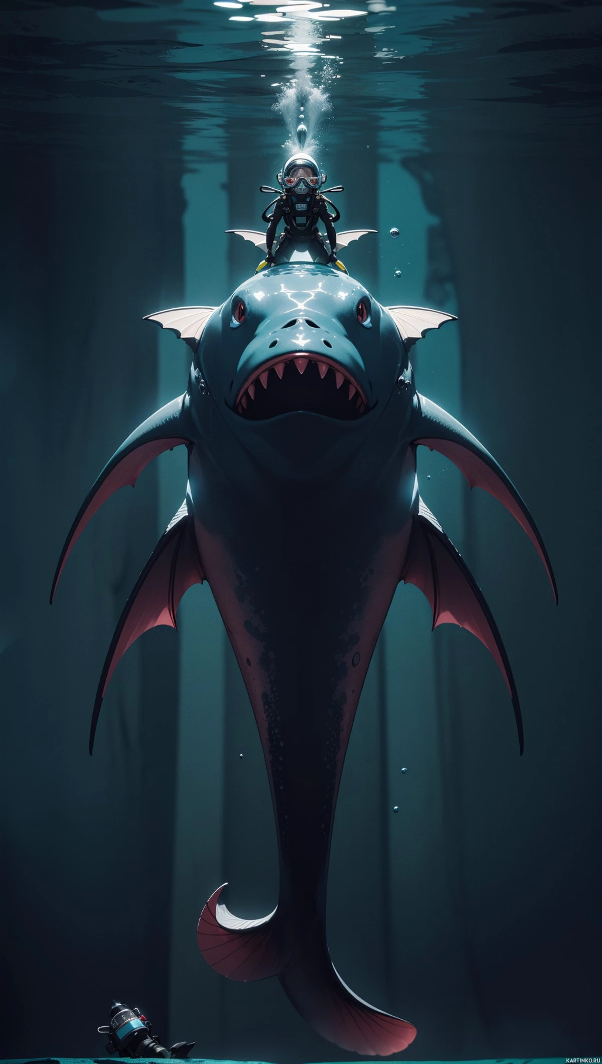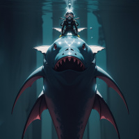 a fantastical scene with a shark-like creature and a human submerged in an underwater setting. The creature, which appears to be halfway between a fish and a whale, has an aggressive expression and is positioned above