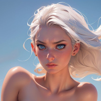 white hair, who appears to be on a beach. She has striking