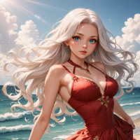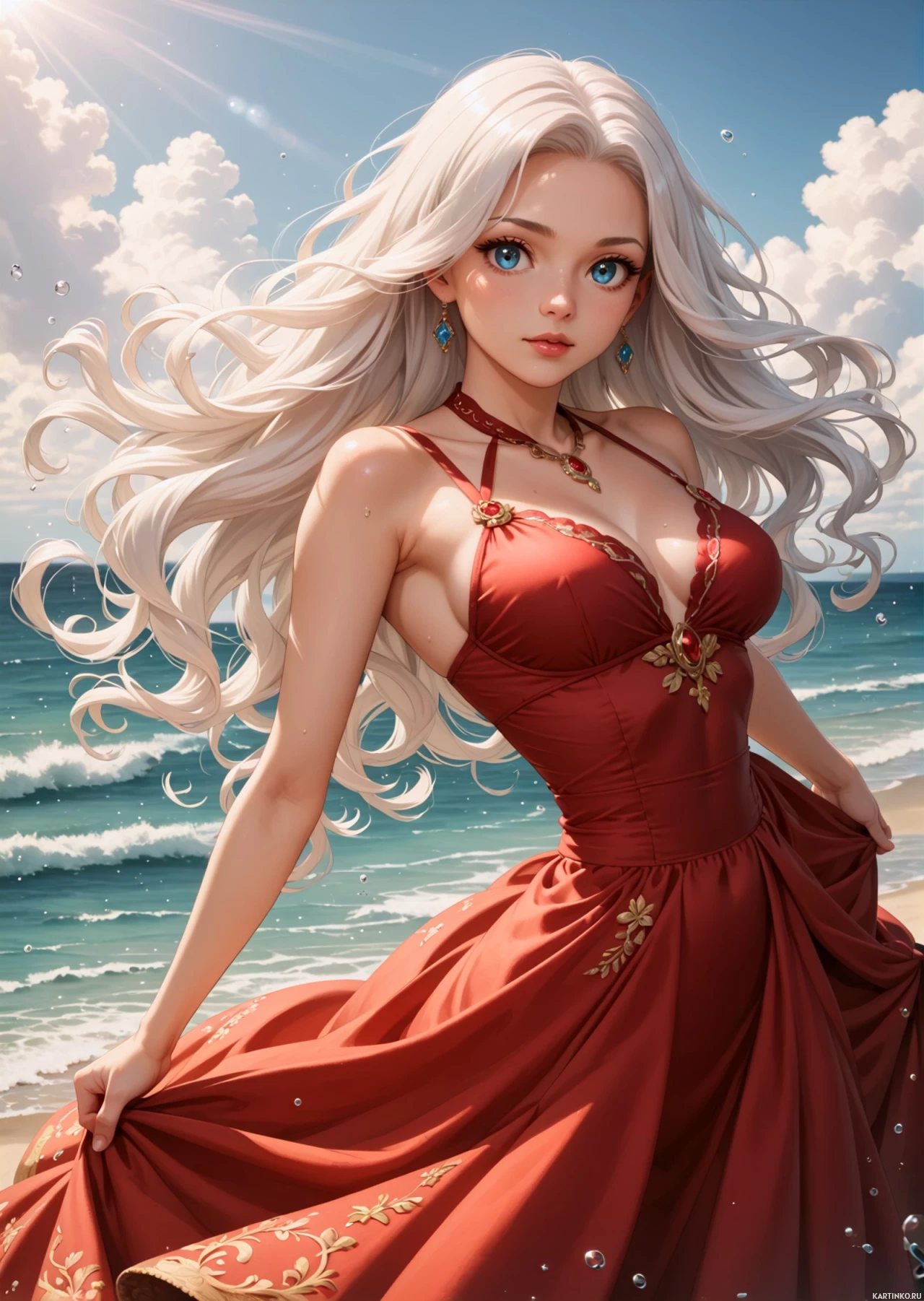 a video game or a concept art for a similar medium. The character is posed in a way that suggests she is walking along the beach, with her dress flowing behind her due to the movement.