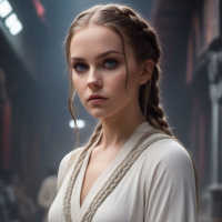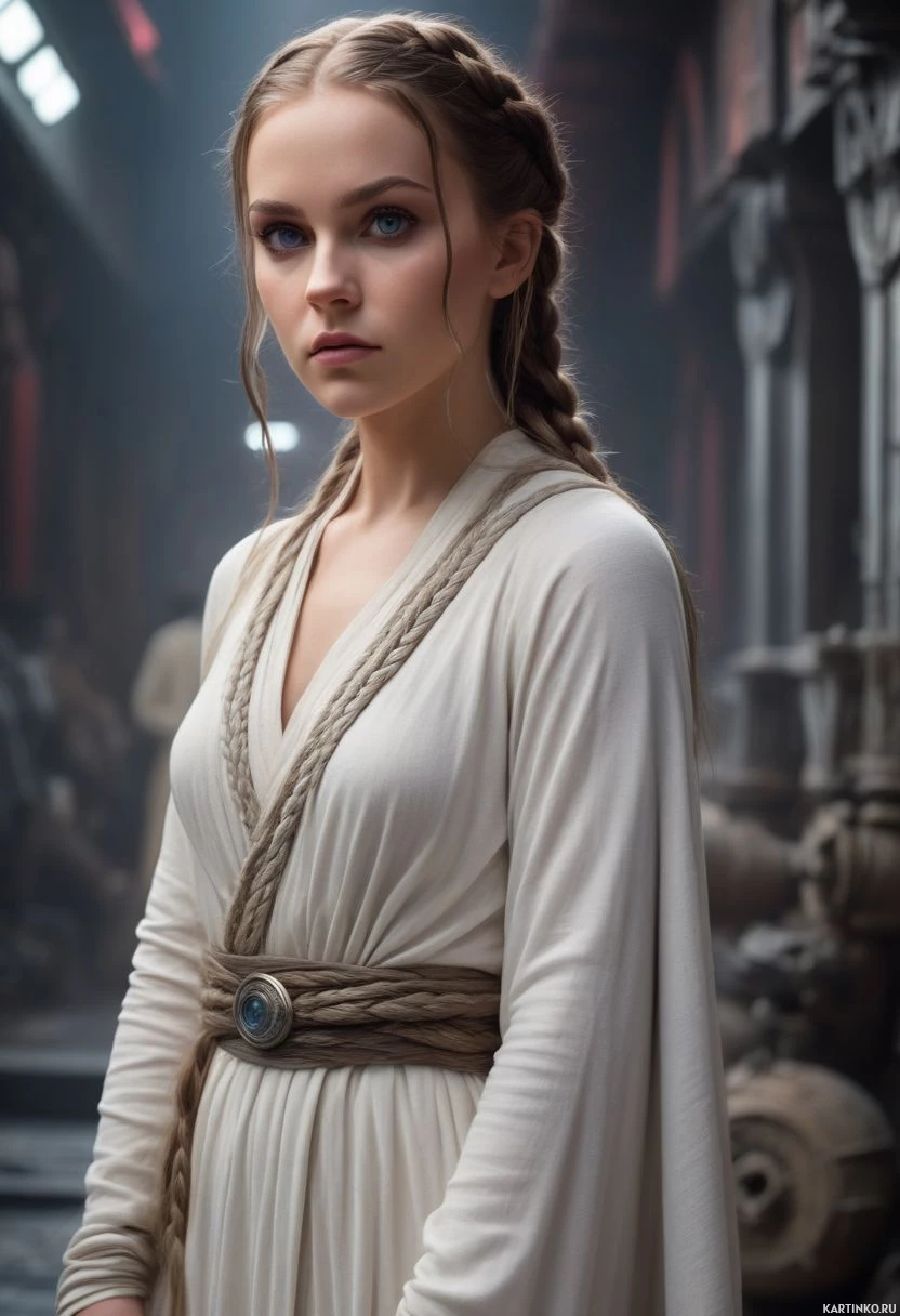 several objects in the background that look like swords, indicating she might be in a place where weapons are stored or used. Her expression is neutral and her