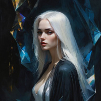 a black jacket and has an ethereal, mystical appearance. In the background, there are crystal formations and