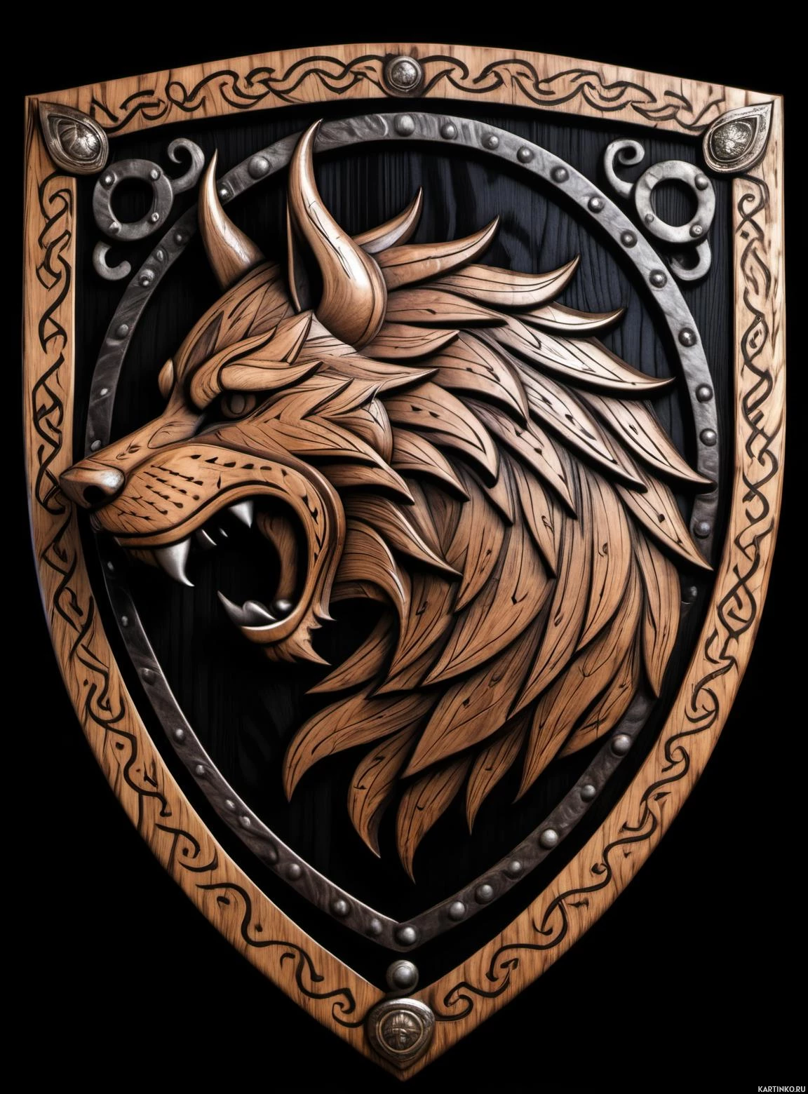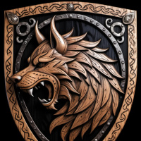 The image displays a stylized shield design with a wolf's head as its central feature. The wolf has detailed fur,