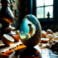 the bright colors of the eggs and adds depth to the scene. The lighting seems soft, with warm tones illuminating the egg's interior, giving it an almost magical quality.