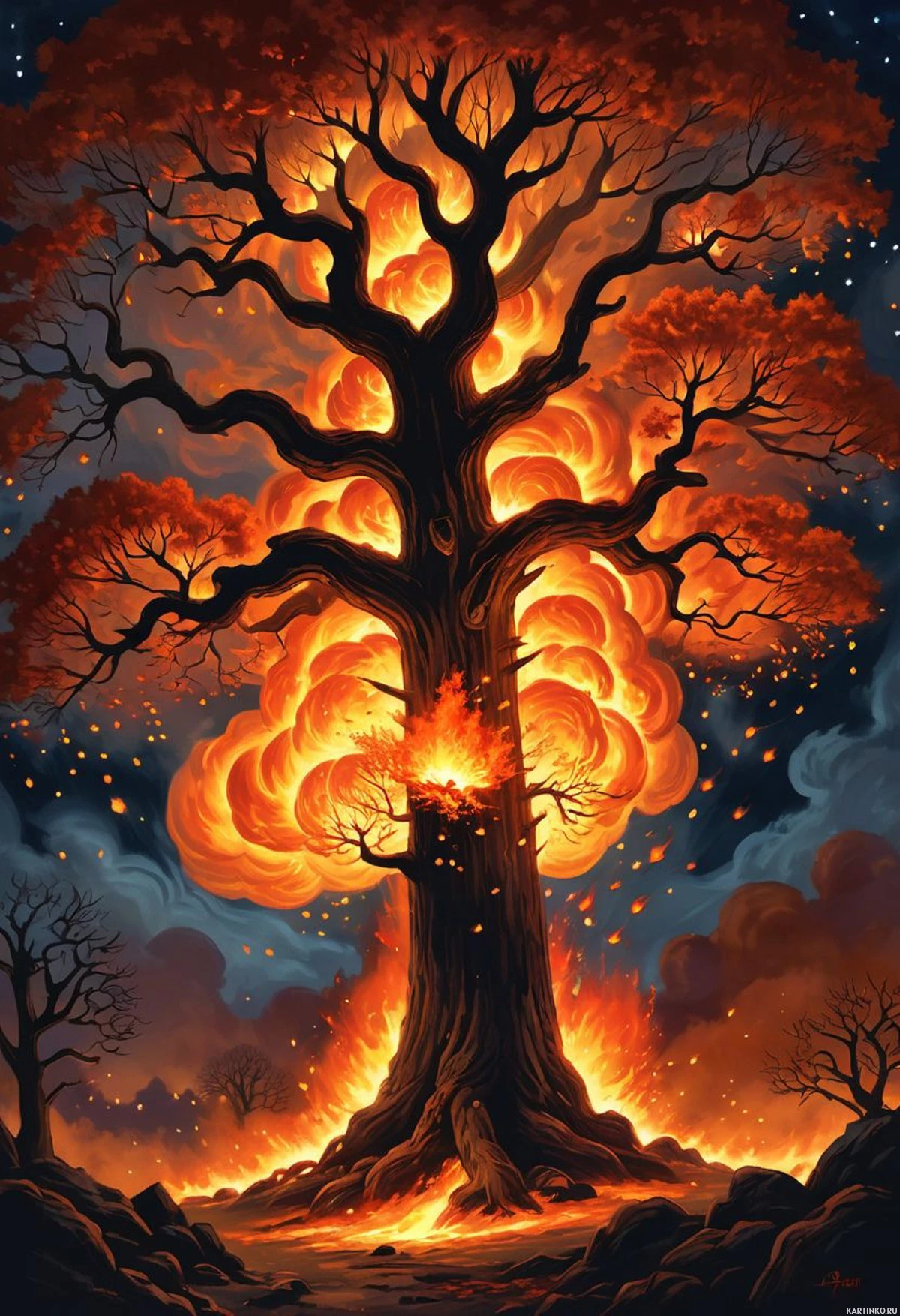 old tree. The tree is ablaze with flames consuming its branches and leaves, casting an intense glow that contrasts sharply with