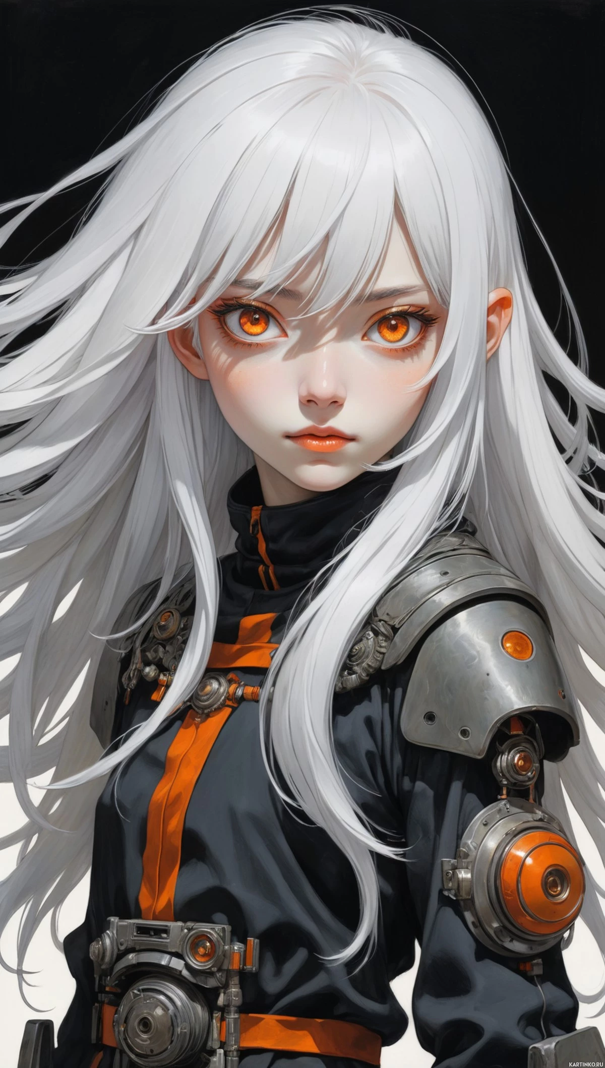 red eyes and is wearing a dark outfit that includes armor elements, such as a chest piece adorned with gears or mechanical details. The background of the image is neutral, allowing the character to stand out prominently.
