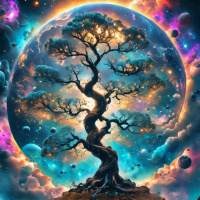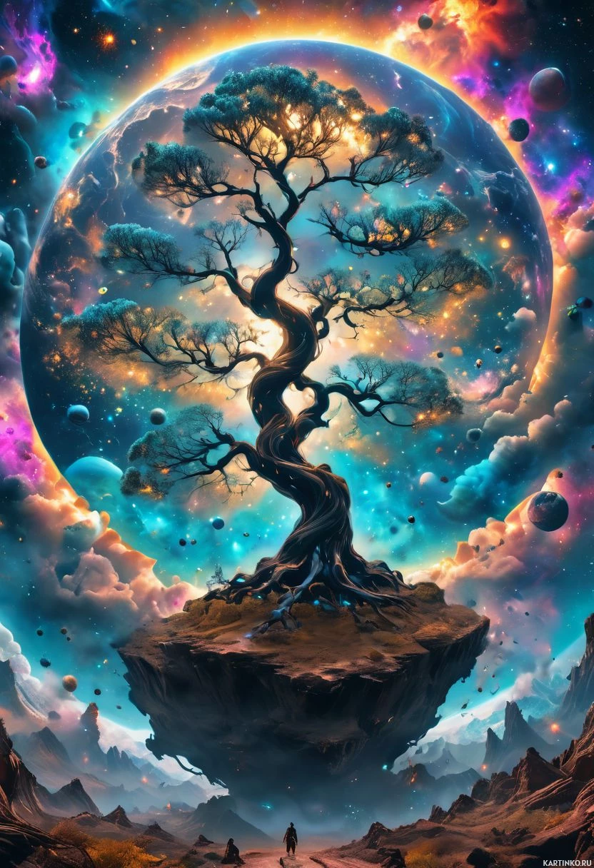 a tranquil scene with a large, ancient tree in the center that is intertwined with a celestial sphere. The tree appears to be on top of a floating island, which is surrounded by clouds and has a vibrant