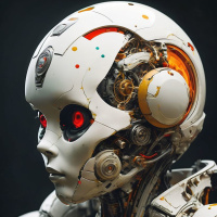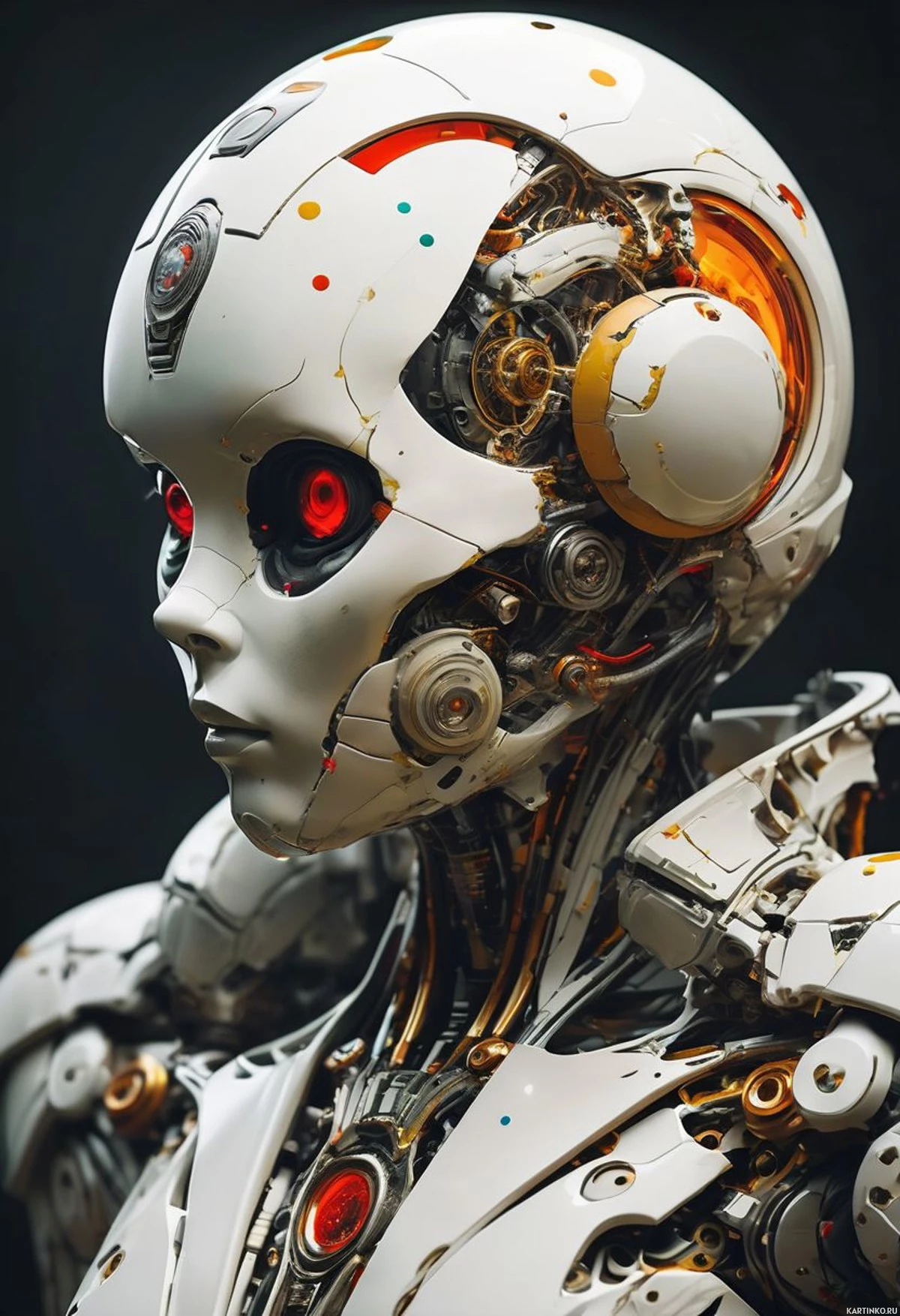 The image depicts a robot with human-like features, such as a head with hair and a face. It has