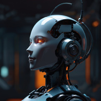 The image portrays a science fiction theme, featuring a humanoid robot with an intricate mechanical face and head. It is set against a background that resembles a futuristic or industrial environment, characterized by pipes and digital displays. The robot's design suggests advanced technology, possibly hinting at artificial intelligence capabilities.