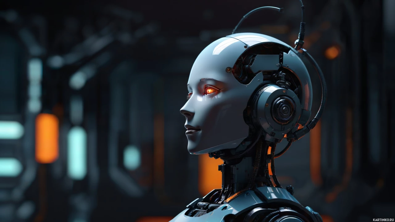 Картинка изображает научно-фантастическую тематику: гуманоидный робот со сложной механической лицевой частью и головой. Задний план напоминает футуристическую или индустриальную среду, с трубами и цифровыми дисплеями. Дизайн робота указывает на передовые технологии, возможно, намекая на возможности искусственного интеллекта.