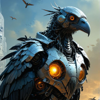 mechanical components. The head of the robot incorporates the features of an eagle, including