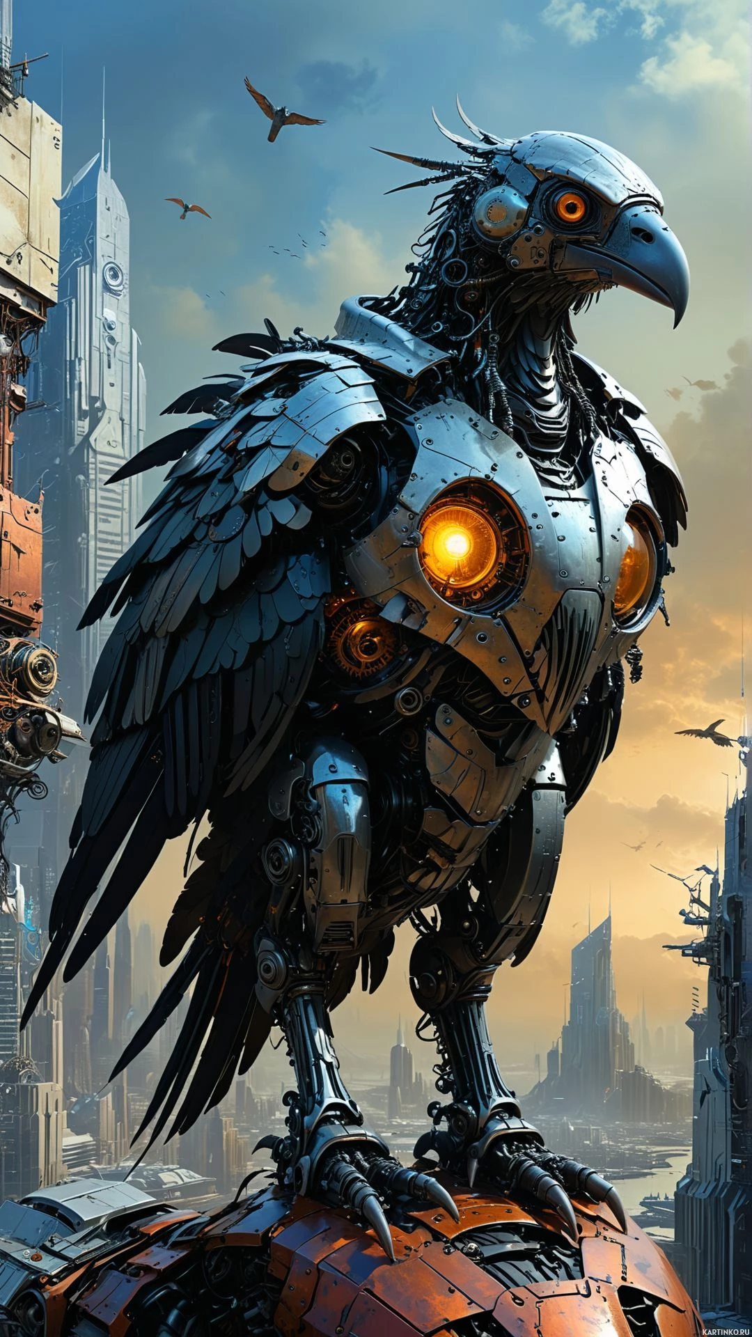 a science fiction scene featuring a robot with an eagle's head. The robot stands on a pile of rubble or debris, positioned in the foreground against a backdrop that includes silhouettes of buildings and structures, possibly indicating