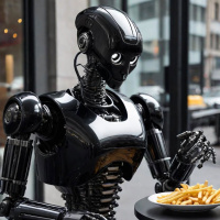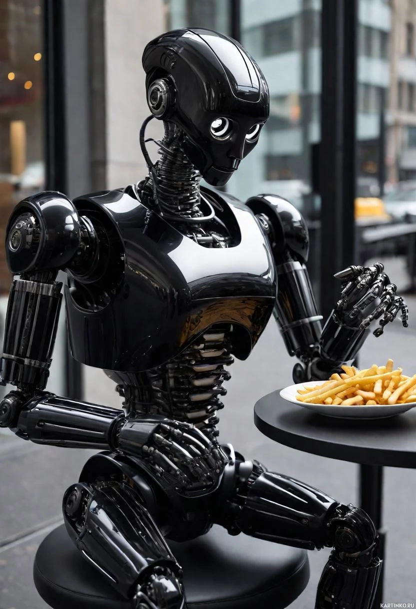 an urban setting. The atmosphere is casual and relaxed, as if the robot were simply enjoying a meal like