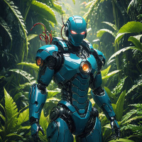 lush greenery that suggests a dense forest or jungle environment. The color palette is dominated by shades of blue for the robot's armor, with hints of silver and orange accents on the joints and panels. The lighting casts dramatic shadows across the image, adding to its intense and