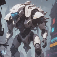 neon signs and digital displays can be seen, suggesting a setting that could be part of a technologically advanced civilization. A single figure is visible in the lower right corner of the image, adding a sense of scale to the scene. This person appears to be looking towards the robot, providing a human perspective on the size and presence of this mechanical entity. The overall atmosphere of the image conveys a blend of realism with science fiction elements, typical in artwork that is meant to evoke a sense of wonder or speculation about the advancements of technology within such a setting. The lighting and shadows in the scene help create depth and give a sense of the environment being lived-in or utilized by the inhabitants.