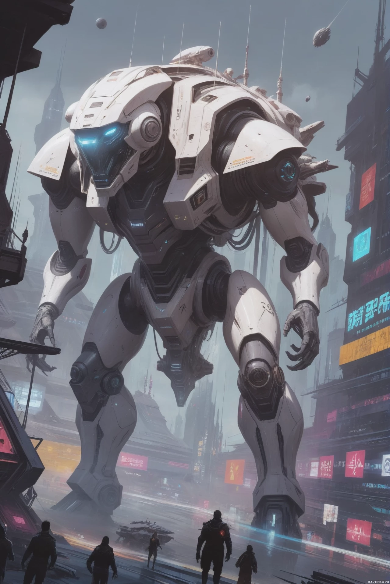 the center of the composition is a large robot, which stands out prominently due to its size and central position in the frame. This robot has a humanoid form with articulated limbs and features that suggest