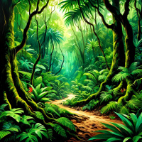 the center of the composition is a winding pathway that seems to invite exploration into the depths of the dense foliage. Flanking the path on both sides are