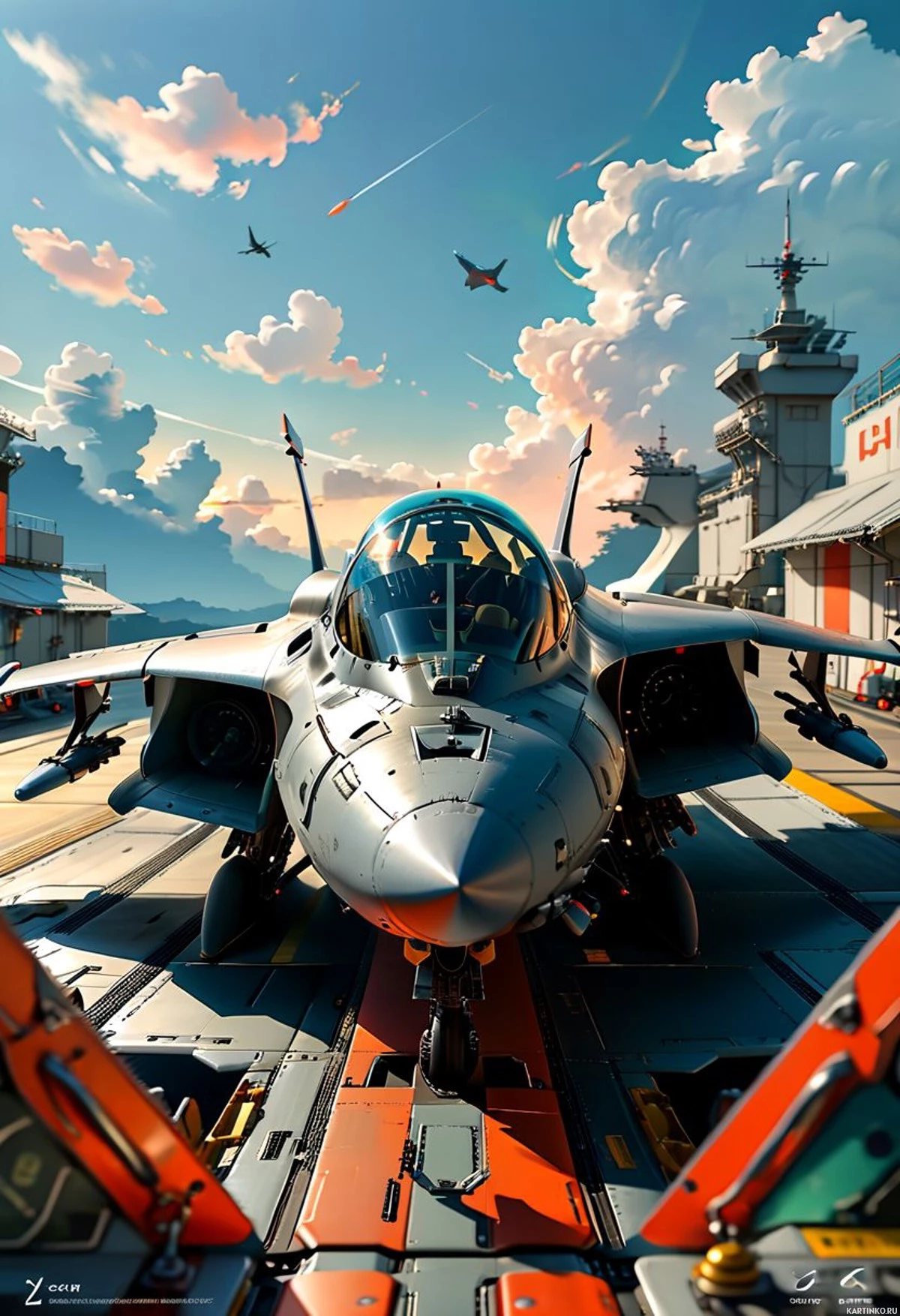 fighter jet parked on an aircraft carrier deck. The jet is equipped with various technical details visible, such as the engine, cockpit, and