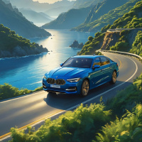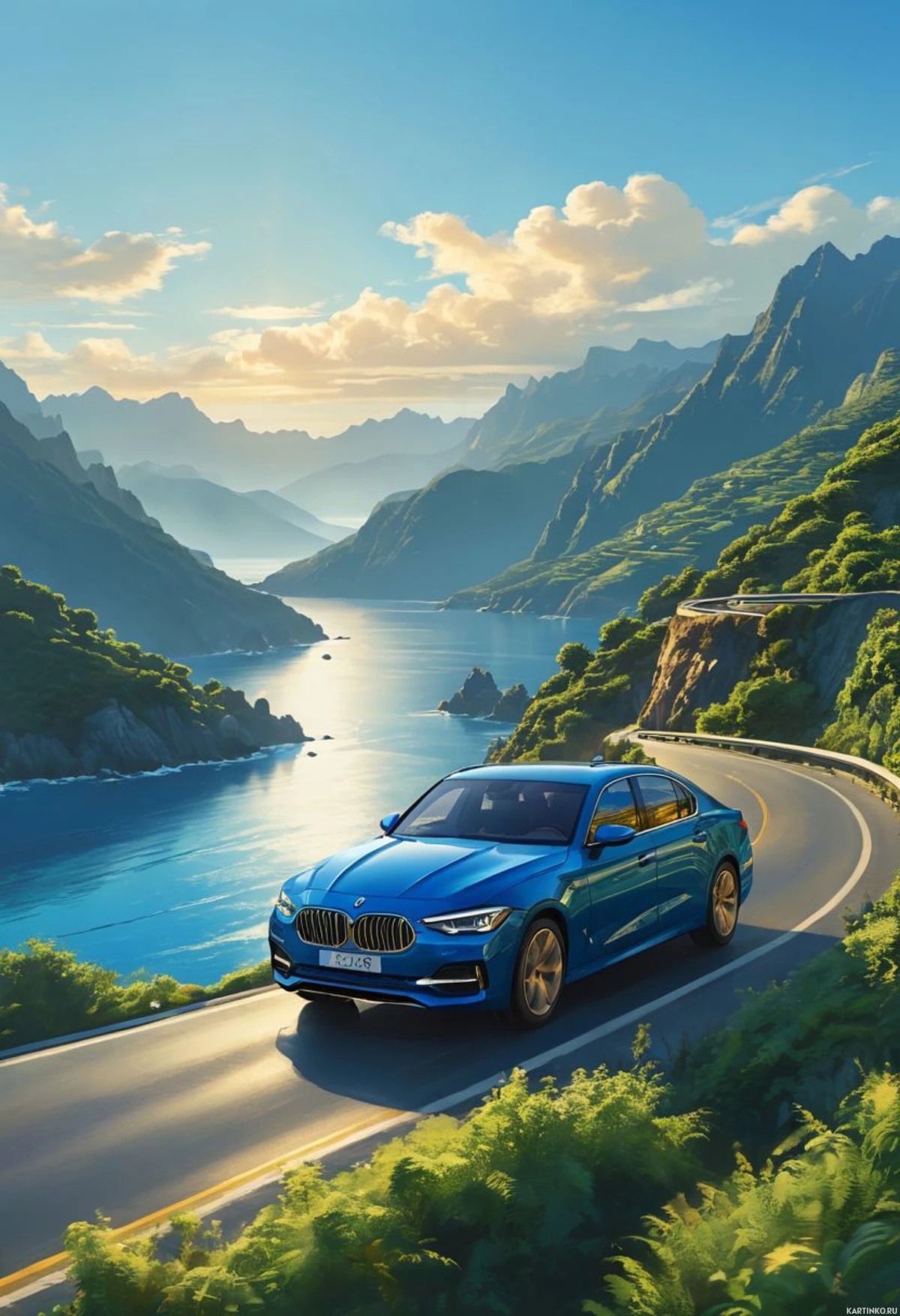 a blue car that appears to be a model from BMW, as indicated by the recognizable logo on the grille. The car is positioned as if it's in motion, traveling along