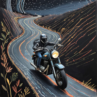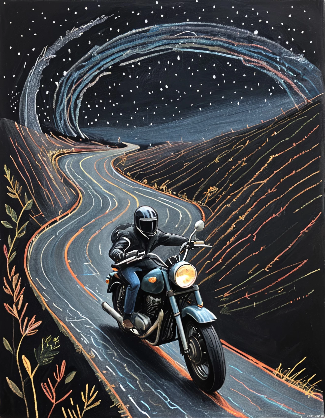 an artistic expression meant to evoke a sense of wonder or solitude. The overall style of the painting has a surreal quality due to these atmospheric and abstract elements intertwined with the more realistic depiction of the road, motorcycle, and rider.