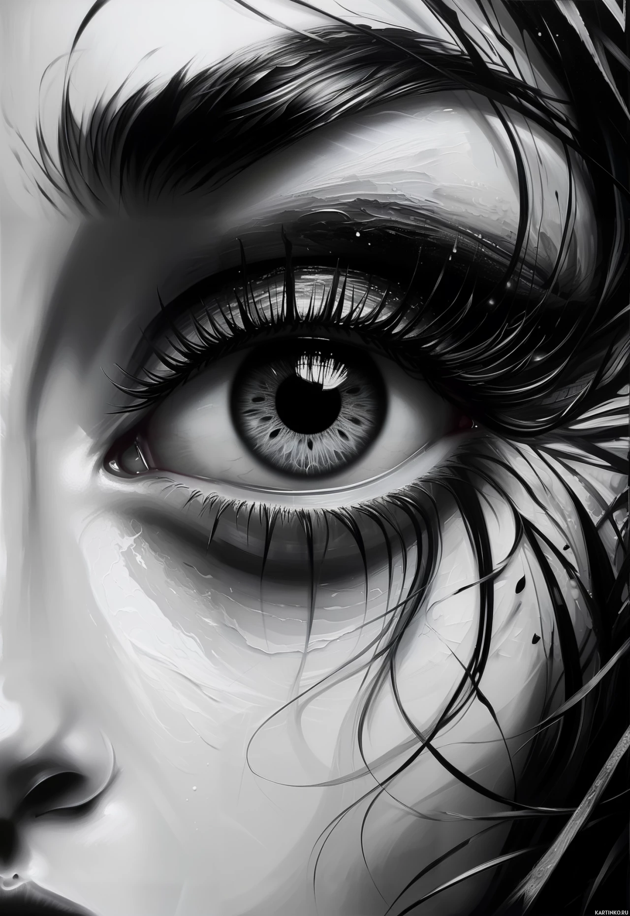 long eyelashes and their eyes are looking directly at the viewer with a slight tilt to their head. There is a subtle teardrop effect visible under the lower lids. The eyeliner appears to be in