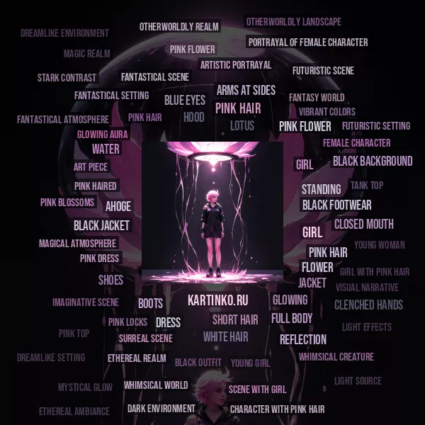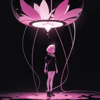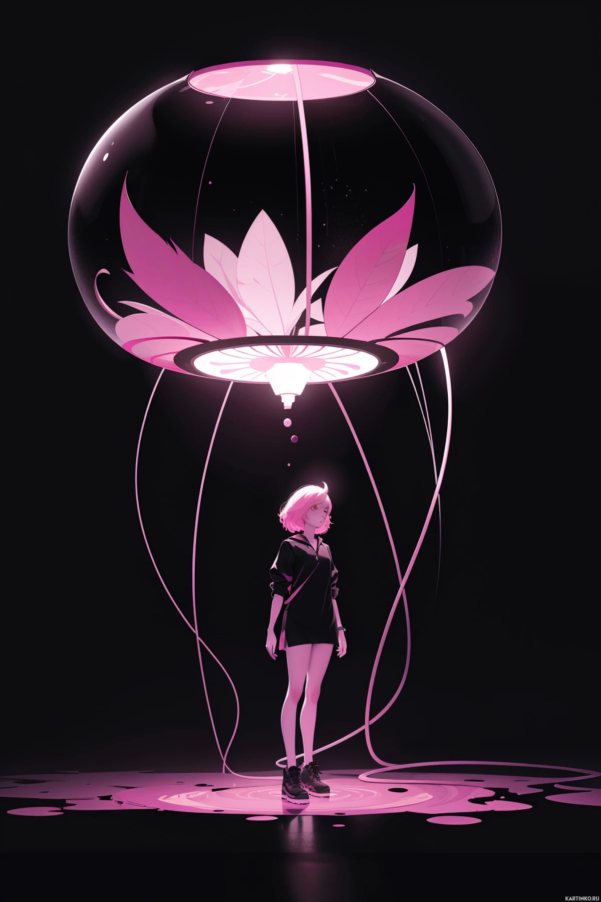 pink flower or perhaps a jellyfish due to its rounded shape with trailing streamers that echo the pink hue of the flower. The setting is dark, with
