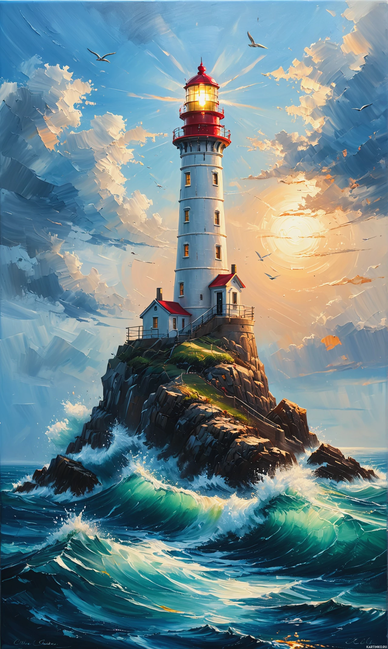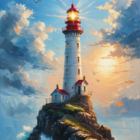 structures on the island itself aside from the lighthouse. The overall color scheme is warm and vibrant, with the sunlight casting shadows and highlights across the scene. The image is highly detailed, capturing the dynamic between the calm