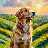 The image shows a golden retriever sitting in a field during what appears to be either sunrise or sunset, given