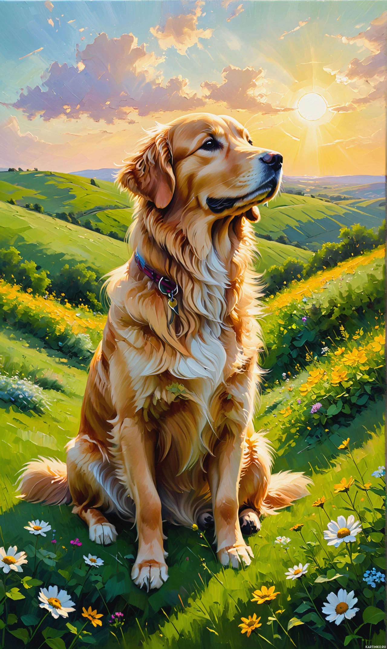 small flowers around the dog, adding to the serene and idyllic atmosphere of the scene.