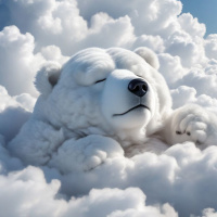the smooth surface of the bear's fur. The overall color palette of the image is cool and subdued, with shades of blue and white dominating the scene. This might be an intentional choice to evoke feelings of calmness and tranquility associated with Arctic landscapes where polar bears are native. The absence of other animals or objects in the immediate vicinity draws focus to the bear as the central subject of the image, highlighting its peaceful slumber within this dreamlike landscape.