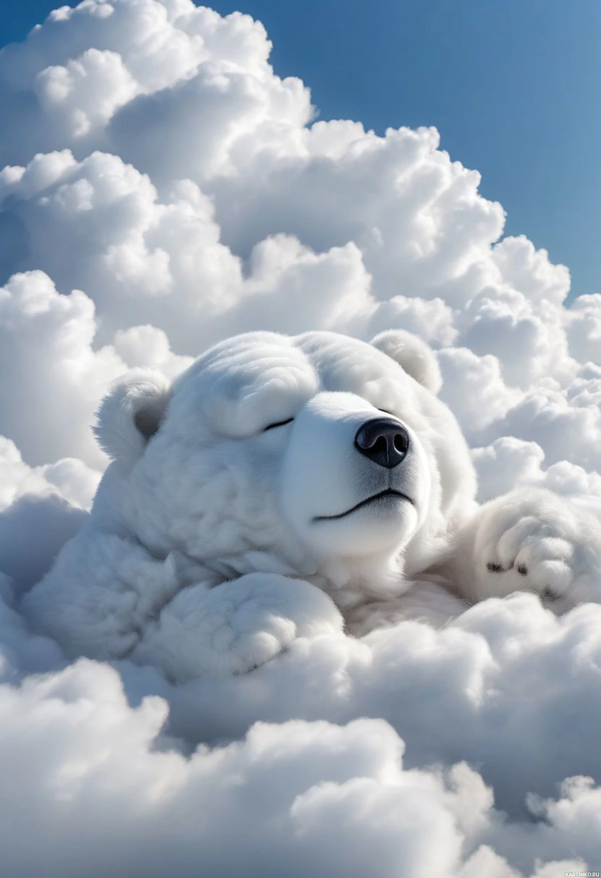 the polar bear seems to be floating above a landscape filled with majestic clouds that reach down towards the ground. The clouds have a soft, fluffy texture that contrasts beautifully with