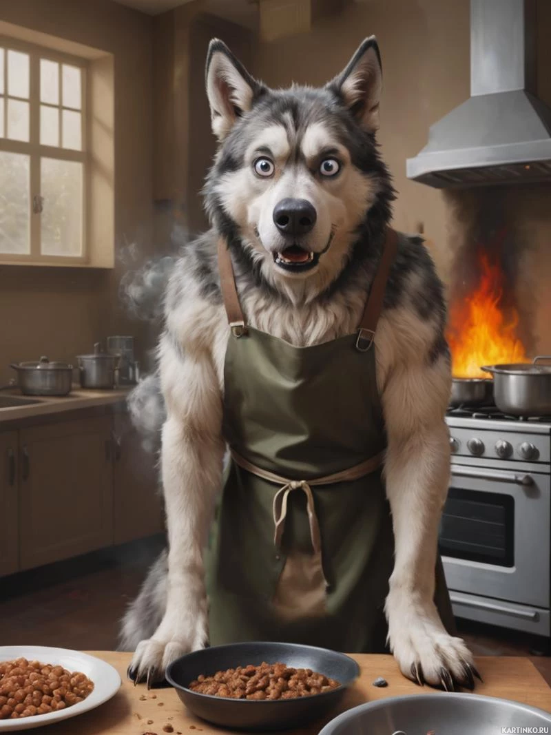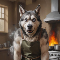 a fantastical scene where an anthropomorphic wolf is standing in a kitchen. The wolf appears to be a werewolf due to its human-like posture and attire. It is wearing an apron over what seems to be its fur, suggesting it might be preparing food or has been cooking. The wolf is facing the viewer directly with