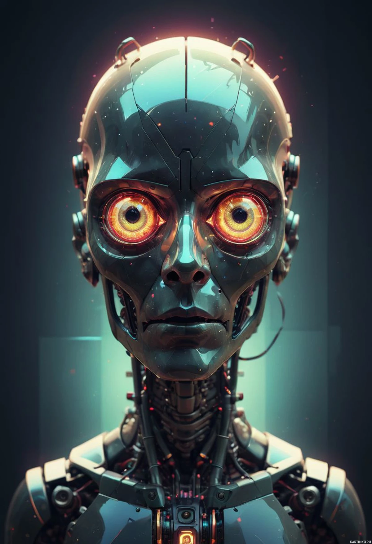 red eyes and multiple layers of metal parts where one might expect facial features like skin or hair. The robot is set against