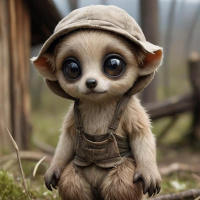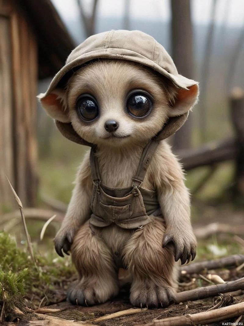 blue eyes and is wearing overalls with straps across its shoulders. The creature is sitting on the ground in what appears to be