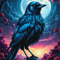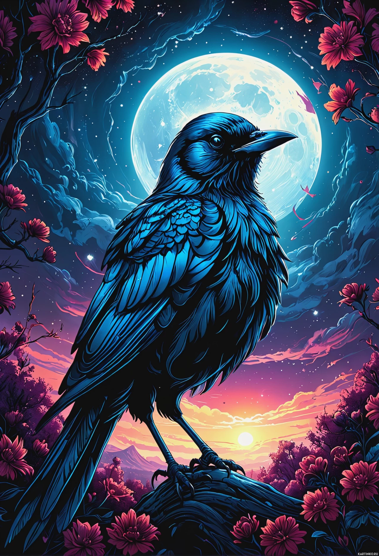 a dynamic pose with its wings slightly extended and appears to be looking towards the viewer or slightly beyond. Below the crow, there is a stylized landscape that includes elements such as trees, flowers, and rocks, leading the eye towards
