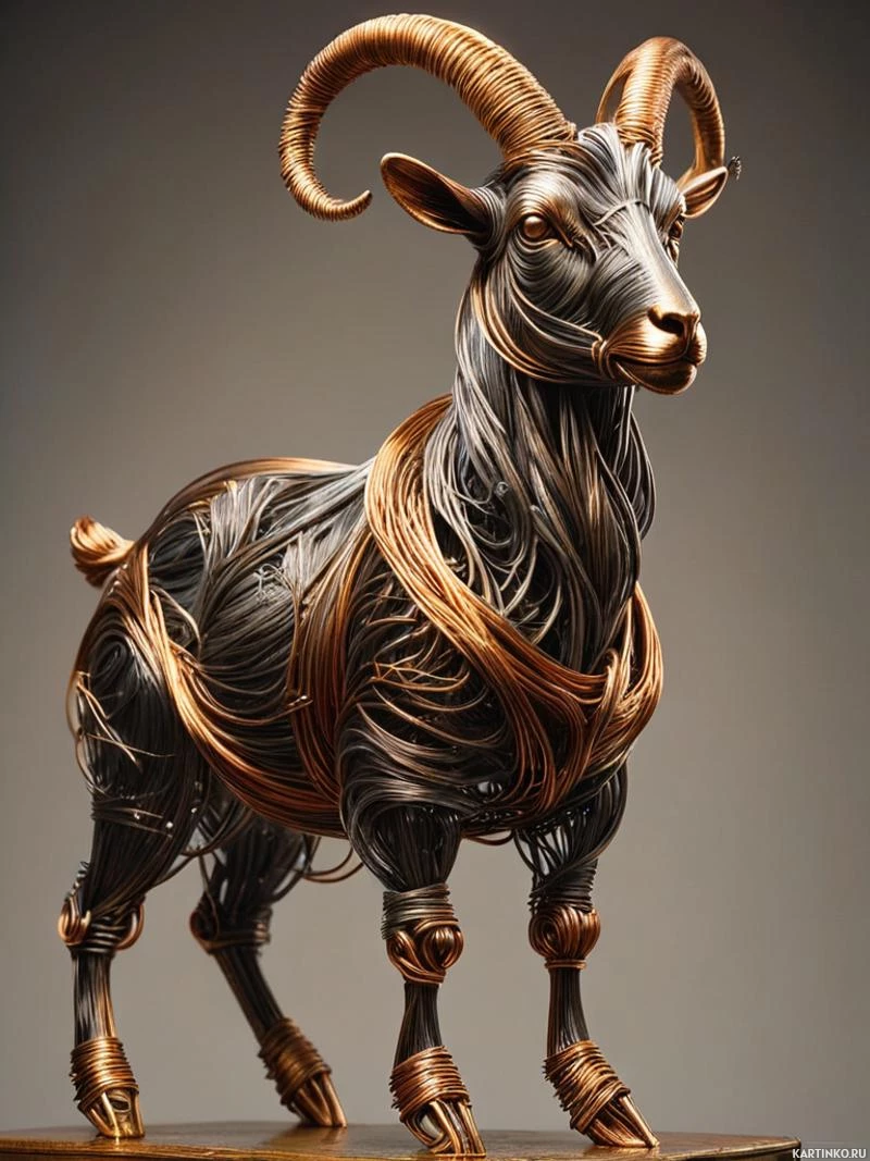 a sculpture of a goat crafted from wire. The goat's body is composed of wiry strands that give it a textured appearance, while its head and horns are more solidly formed with the same material. It has distinctive features such as