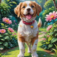 The image features a brown and white dog standing on what appears to be a path in an idyllic, forest-like setting. The dog is smiling or showing its teeth, suggesting it might be happy or excited. There are