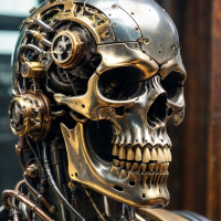a human skull, but the facial features are not present; instead, there are several mechanisms visible on the surface of what would normally be the face. These include what looks like gears or machinery, suggesting some form of