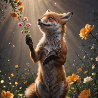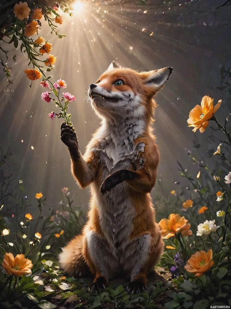 hind legs, with one paw touching a flower. The fox appears to be smelling or examining the flower closely. Its expression is attentive and curious. The background features silhouettes of trees and what looks like