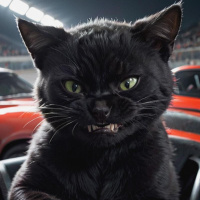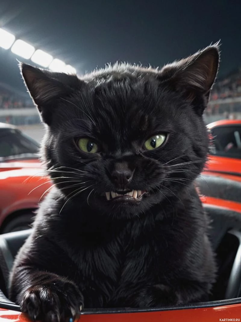 a black cat sitting inside what appears to be a car's steering wheel. The cat has its ears pointed upwards,