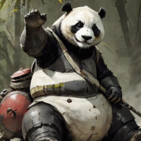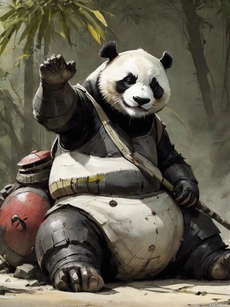 panda character, which means it has human-like features. This character is seated on a rock and appears to be in